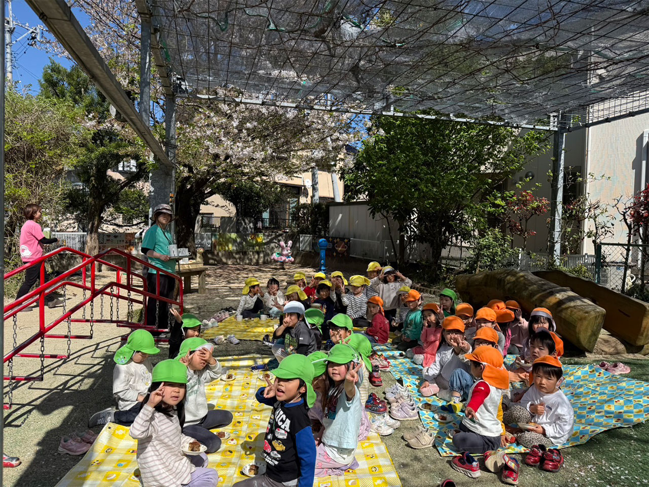 園庭の花も色あざやかに咲き、子どもたちは桜の木の下でおやつを食べながら花見を楽しみました。