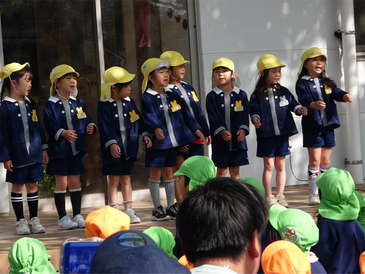 年長児が新しい友だちに向けてお祝いの言葉とダンスを披露しました。皆さん親子で嬉しそうに見ていました。