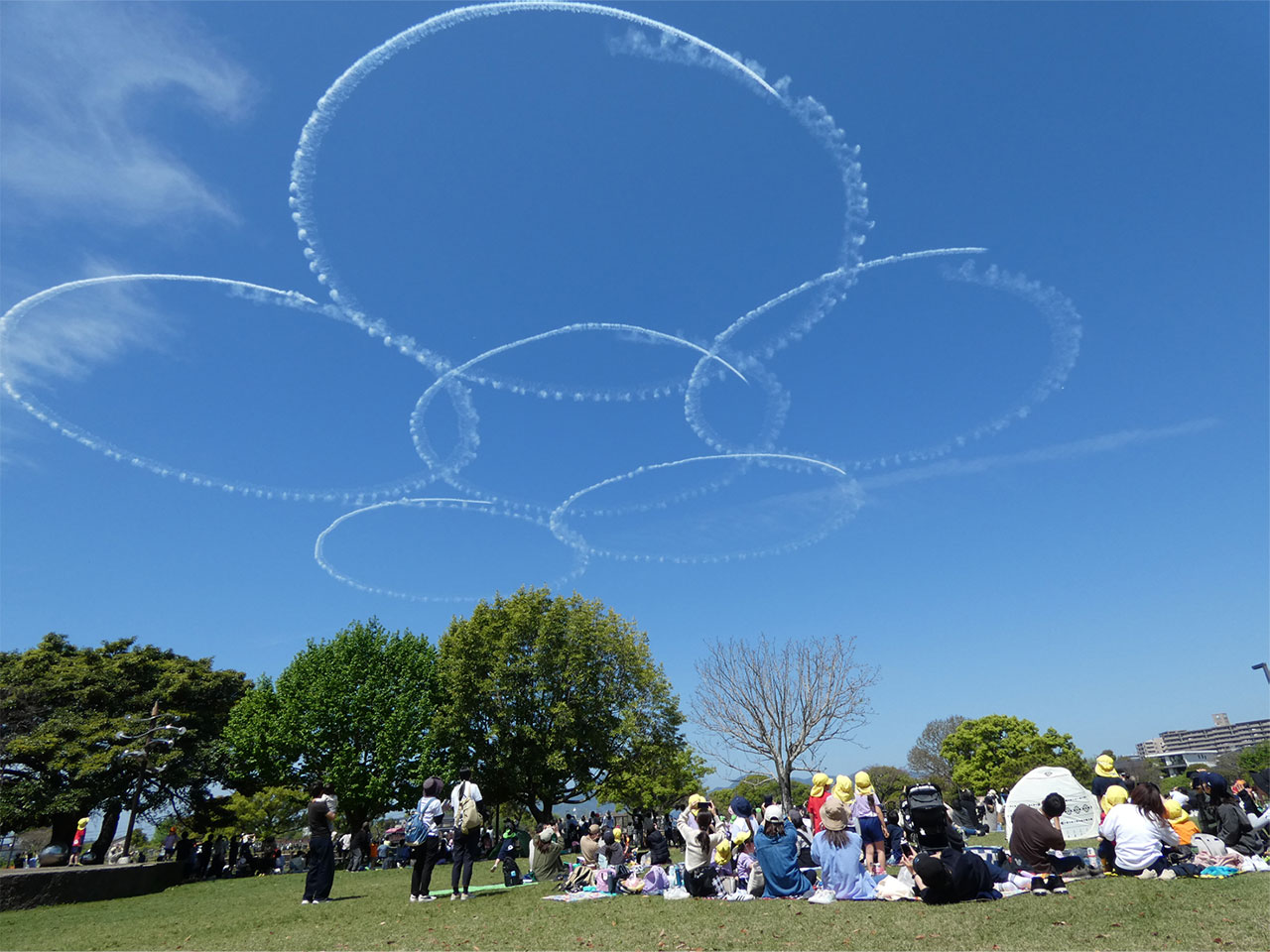 スタンプラリーをしながら江津湖のゴールを目指して歩きました。クラスごとに自己紹介をしてお弁当を食べていると空にブルーインパルスの飛行が見られ心に残る一日となりました。