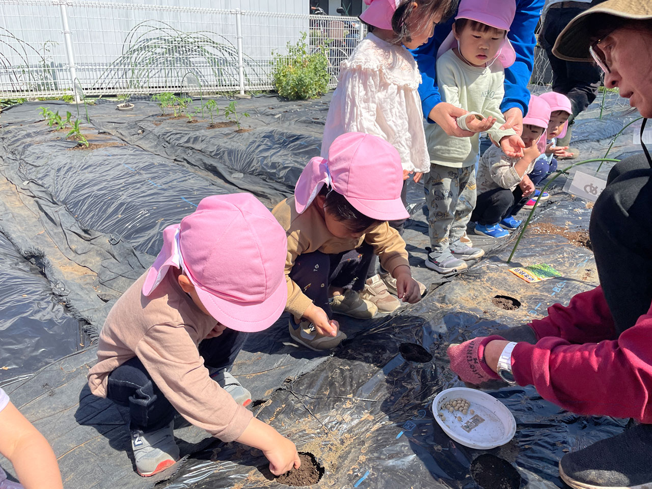 夏に向けて野菜の種や苗植えをしました。各クラスで育てる野菜を決めて収穫を期待しながら植えていました。